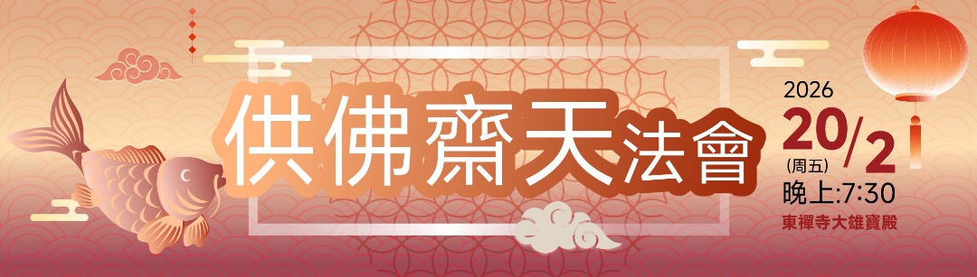 【2026供佛齋天法會】 正月初九是民間的「拜天公」喜慶之日,本寺將在國歷2月20日週五晚上7點半舉辦供佛齋天法會,邀請民眾來到佛門中,感念諸天神明不分晝夜護持三寶、讓佛法常住世間,以漢傳佛教自古以來流傳甚廣的《金光明齋天法儀》,備辦了素齋虔誠迎請諸天蒞臨受供,表達對三寶護持之意。 欲參加法會及登記功德者,可至服務台或線上查詢。